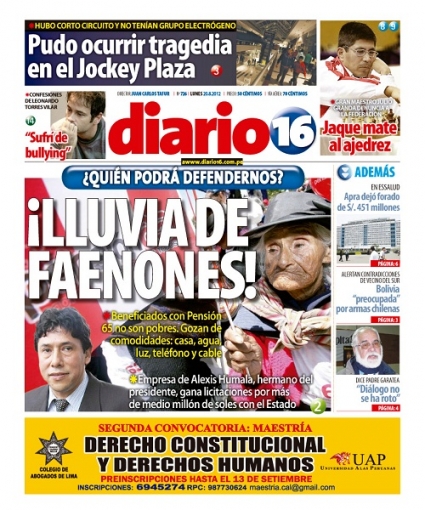 Finalizamos este repaso con Diario 16. Uno de los programas sociales emblema del Gobierno del mandatario Humala, Pensión 65, estaría siendo utilizado para cometer presuntos actos ilícitos, otorgando dinero cada dos meses a personas que no muestran una situación de pobreza extrema.
