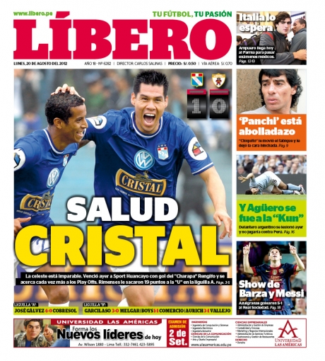 De esta manera, el diario Líbero tituló: 'Salud Cristal', en alusión al triunfo celeste sobre el Sport Huancayo 1-0 con anotación del artillero nacional Hernán Rengifo.