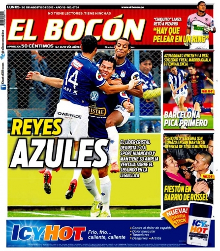 Por su parte, El Bocón también resalta en su portada la victoria cervecera titulando: 'Reyes Azules' tras el triunfo ante los huancaínos con su tradicional camiseta alterna que lo ubican en lo más alto de su grupo.