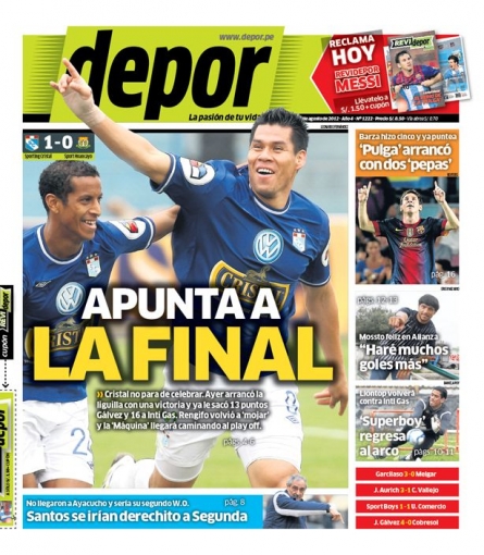Culminando el recorrido de hoy, el diario Depor tituló: 'Rumbo a la final', en referencia a la victoria del equipo del Rímac que lo ubica primero con 13 puntos de ventaja sobre José Gálvez y 16 unidades al Inti Gas.