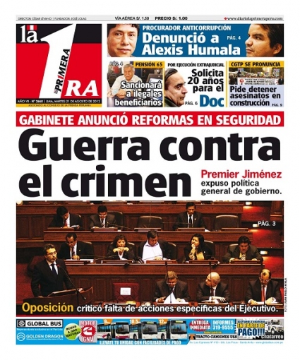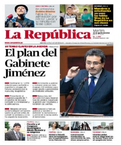 Por su parte, el periódico La República cede interés al Gabinete ministerial. El primer ministro Juan Jiménez consiguió el voto de confianza del Congreso de la República, tras una sesión que duró más de 11 horas y que terminó con 73 votos a favor y 38 en contra.