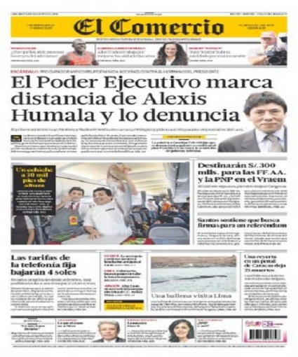 Iniciamos el desarrollo de la información con el decano de los medios locales, El Comercio. El procurador presentó en la tarde de ayer un pedido al Ministerio Público para que se inicien pesquisas al menor del clan Humala Tasso, luego de conocer a través de un programa periodístico las licitaciones que su firma obtuvo para vender productos químicos a diversos portafolios, entre ellos el Ministerio de Salud.