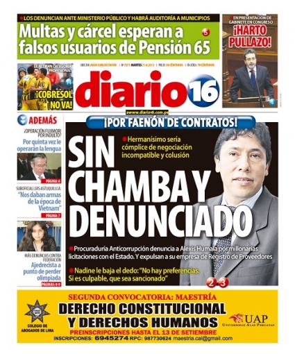 Entre los temas más destacados por la prensa escrita peruana para hoy martes 21 de agosto, está la denuncia que puso el procurador anticorrupción Julio Arbizu para investigar al hermano del presidente de la República Alexis Humala, por presuntos negocios irregulares entre el Estado y su compañía.