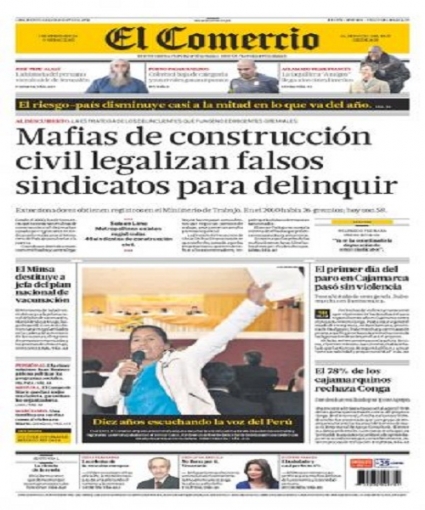 Cerramos este recorrido con el decano de la prensa local, El Comercio, que ofrece en su portada de hoy una investigación sobre presuntas mafias en construcción civil, que legalizan falsos sindicatos para delinquir.