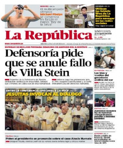 Entre los temas más destacados por la prensa escrita peruana para hoy miércoles 22 de agosto, está el pedido de la Defensoría del Pueblo de anular la sentencia de la Sala Penal del Poder Judicial presidida por Javier Villa Stein sobre los integrantes del grupo Colina, que les reduce la pena en cárcel efectiva de 25 a 20 años, y deja de lado el concepto de lesa humanidad.