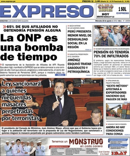 Por su parte, el periódico Expreso cede interés a la Oficina de Normalización Previsional (ONP). El representante de la Asociación de Afiliados de AFP, Ricardo Escudero Vigil, sugirió convocar una comisión de alto nivel que inicie el cierre progresivo del Sistema Nacional de Pensiones (SNP), ya que en el futuro no podrá cumplir sus promesas con los jubilados. “La comisión deberá estar integrada por verdaderos especialistas entendidos en el régimen pensionario, para que propongan una alternativa inmediata a la quiebra del SNP”, detalló.