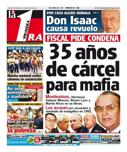 Las temáticas relativas a la corrupción fueron seleccionadas para la primera hoja de La Primera. El fiscal superior, César Pacífico, pidió 35 años de prisión para el exasesor presidencial Vladimiro, el exjefe del Servicio de Inteligencia Nacional Julio Salazar Monroe, el exjefe del Comando Conjunto de las Fuerzas Armadas Nicolás Hermoza, el exjefe del Servicio de Inteligencia del Ejército Juan Rivero Lazo y un grupo de exmiembros del Grupo Colina (Gabriel Vera Navarrete y Carlos Pichilingue), por ser autores mediatos de la desaparición y asesinato de Fortunato Gómez Palomino el 9 de julio de 1992.