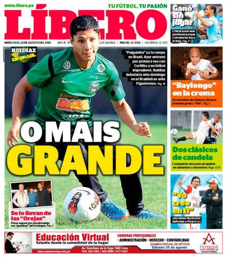 De esta manera, el diario Líbero tituló: 'O mais grande', en referencia al peruano que sorprendió en su primera práctica por su buen juego y quedaría apto para debutar ante el Figueirense.