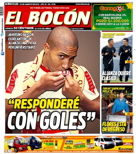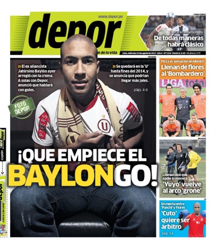 Por su parte, el diario Depor titula: 'Que empiece el BAYLONgo' en alusión a la llegada de Jahirsino Baylón a la 'U'. El ex Alianza Lima y Sport Huancayo dijo que hablará con goles.