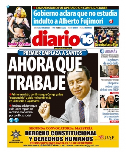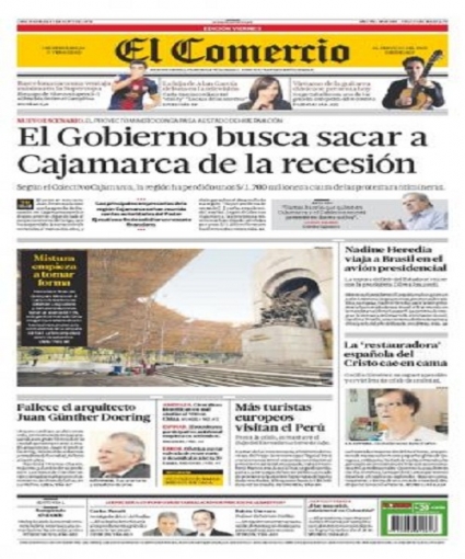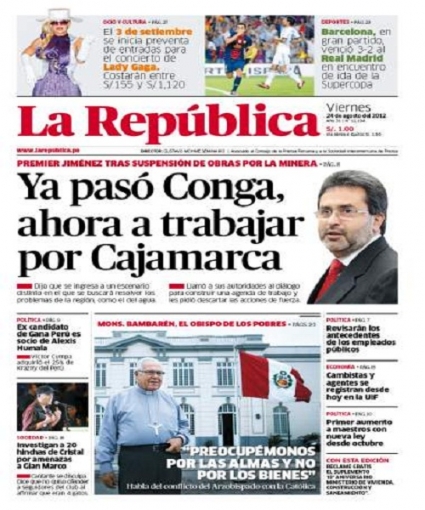 Entre los temas más destacados por la prensa escrita peruana para hoy viernes 24 de agosto, están las declaraciones del primer ministro Juan Jiménez respecto a la recesión que afronta el departamento de Cajamarca, producto de las manifestaciones contra el proyecto minero Conga que afectó diversos sectores económicos locales.