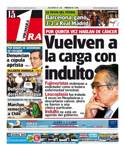 Cerramos este recorrido con La Primera, donde el tema del indulto presidencial vuelve a sonar para el exmandatario Alberto Fujimori, luego que este fuera sometido a una intervención quirúrgica por una nueva leucoplasia que le fue extirpada de la cavidad bucal; mientras que Diario 16 también cede interés a las palabras del primer ministro Jiménez respecto a Cajamarca.