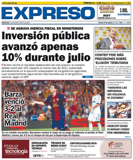 Los temas económicos lograron exhibirse en la cara del vespertino Expreso. De acuerdo al Reporte Seguimiento del Presupuesto del Ministerio de Economía y Finanzas (MEF), la inversión pública creció en julio un 10%, cifra inferior si se compara con la lograda en el mismo mes de 2011, siendo la menor tasa registrada en el año y lo que determina que la inversión pase de 19% al primer trimestre a 17% en julio.