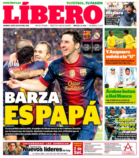 De esta manera, el diario Líbero tituló: 'Barza es papá', en alusión al ajustado triunfo del equipo catalán en el Camp Nou con goles de Pedro, Messi y Xavi.