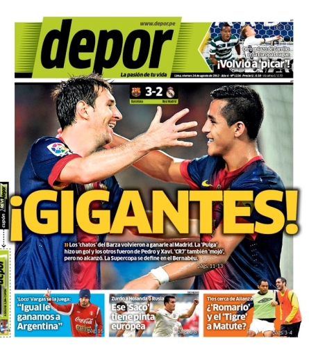Por su parte, el diario Depor también resalta el triunfo catalán titulando: '¡Gigantes!' luego del 3-2 a favor del equipo de Tito Vilanova sobre un conjunto madridista que tiene la opción de poder definir la Supercopa española en el Santiago Bernabéu.