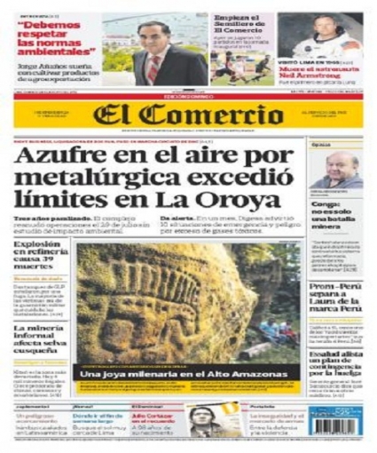 Cerramos este repaso con el decano de la prensa peruana, El Comercio, donde se afirma que en La Oroya los niveles de azufre en el aire exceden los límites establecidos, producto al parecer de operaciones metalúrgicas.