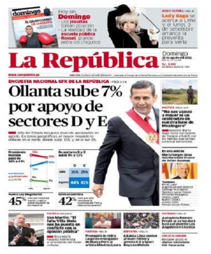 Entre los temas más destacados por la prensa escrita peruana para hoy domingo 26 de agosto, está la reciente encuesta nacional-urbana de la consultora GFK, donde el presidente de la República Ollanta Humala es respaldado por el 43% de los peruanos, aumentando su popularidad unos siete puntos porcentuales respecto a julio.