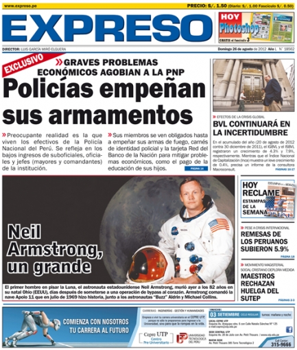 Por su parte, el diario Expreso hace hincapié en la situación económica que atraviesa la Policía Nacional del Perú (PNP). Según un informe de este medio, hay integrantes de la PNP que se ven obligados a empeñar sus armas para obtener dinero que les permita satisfacer varias necesidades, e incluso esto habría generado el crimen del pasado 14 de agosto en la Dirección Territorial Policial (Diterpol) de la región Arequipa.