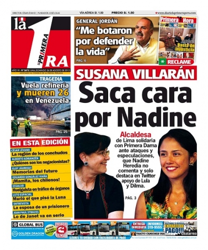 Ahora es el turno del vespertino La Primera. La alcaldesa de Lima, Susana Villarán, mostró su apoyo a la Primera Dama Nadine Heredia por el viaje que hizo a Brasil en el avión presidencial, acompañando a una delegación del Gobierno presidida por la ministra de Inclusión Social Carolina Trivelli, calificando a la segunda como una mujer “dinámica e inteligente”.