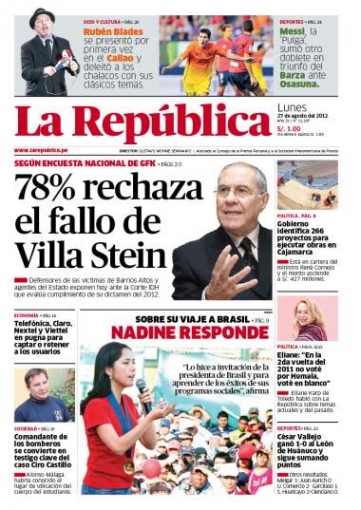 Entre los temas más destacados por la prensa escrita peruana para hoy lunes 27 de agosto, se encuentra el descontento general de la población por la sanción final que recibieron los integrantes del denominado grupo Colina, dictada por la Sala Penal presidida por el magistrado Javier Villa Stein, que reduce los años de pena en cárcel y elimina de los casos el concepto de lesa humanidad.