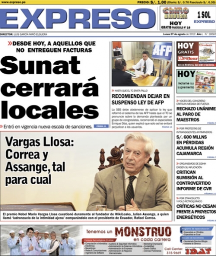 Los temas locales se colocan en la primera hoja del diario Expreso. La Superintendencia Nacional de Aduanas y de Administración Tributaria (Sunat) dio luz verde a una resolución que actualiza el régimen de gradualidad de sanciones relativas a las infracciones cometidas por no presentar o entregar comprobantes de pago, y que desde hoy entra en vigencia.