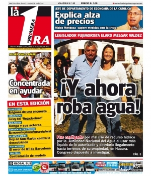 Por su parte, el vespertino La Primera cede interés al partido congresal Fuerza 2011. La Autoridad Nacional del Agua (ANA) sancionó con una multa al congresista fujimorista Elard Melgar Valdez, por utilizar el recurso hídrico más de lo permitido pra desviarla ilícitamente hacia terrenos de su propiedad en la provincia de Huaura.