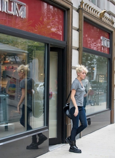 La actriz de 19 años de edad, llevaba una camiseta gris sin respaldo durante su parada en Tumi unos pantalones ajustados y unas botas de combate para terminar de combinar.