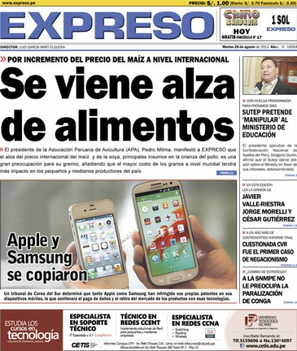 Los temas económicos lograron aparecer en la primera hoja de Expreso. El presidente de la Asociación Peruana de Avicultura (APA), Pedro Mitma, reconoció que el alza del precio internacional del maíz y la soya preocupa al gremio por ser estos los principales insumos de alimentacion del pollo, ya que esto tendrá un impacto en la economía de los pequeños y medianos productores.