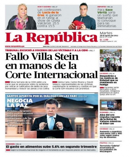 Por su parte, el periódico La República se ocupa del grupo Colina. La representante de la Comisión Interamericana de Derechos Humanos (CIDH), Silvia Serrano, pidió a la Sala Penal Permanente presidida por el magistrado Javier Villa Stein a explicar las razones por las que retiró la figura penal de lesa humanidad en los procesos penales a los integrantes de la citada agrupación, al igual que la reducción de los años en cárcel.