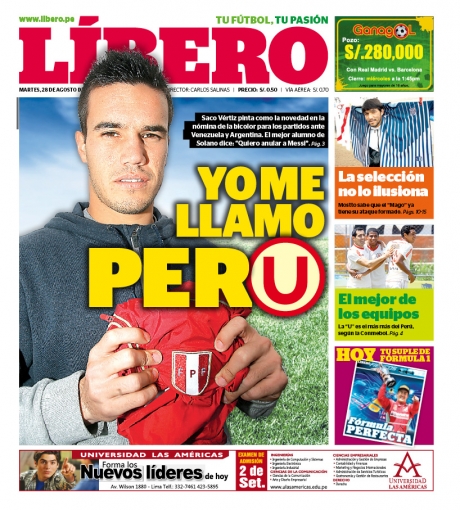 De esta manera, el diario Líbero tituló: 'Yo me llamo Perú', en referencia al llamado de Saco Vértiz a la 'bicolor' que se sabrá el día jueves en que el técnico Sergio Markarián publicará su lista oficial de convocados.