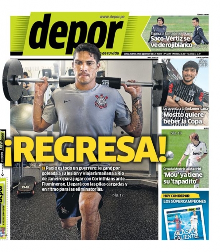 El diario Depor titula en su carátula: '¡Regresa!', en alusión al delantero peruano Paolo Guerrero que superó su lesión al tobillo y jugará mañana ante el Fluminense por el Brasileirao.