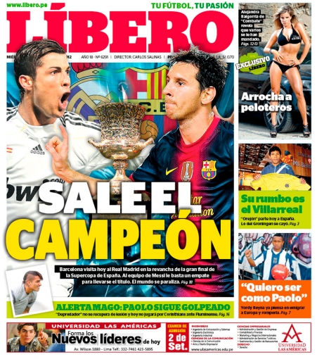 De esta forma, el diario Líbero tituló: 'Sale el campeón' en referencia al esperado choque en el que el equipo merengue buscará vencer a un cuadro catalán que ganó el duelo de ida por 3 a 2 y que figura como principal favorito a llevarse dicho título.