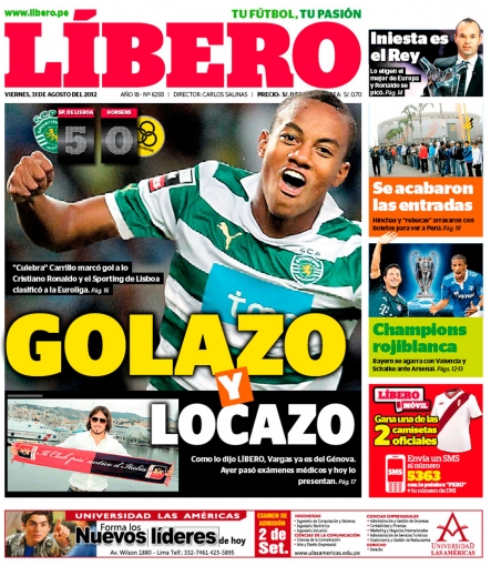 De esta manera, el diario Líbero tituló: 'Golazo y locazo', en referencia al gol anotado por la 'Culebra' en la goleada del Sporting de Lisboa 5-0 sobre el Horsens que le permitió clasificarse a la Europa League y la llegada del volante peruano Juan Manuel Vargas para fichar por el Génova de Italia.