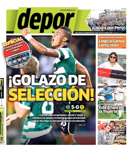 El diario Depor también resaltó la buena actuación de Carrillo con el Sporting, además de la llegada del 'Loco' Vargas a Génova y el sorteo de la Champions League que tendrá al Real Madrid vs. Manchester City y el Chelsea vs. Juventus como los partidos más atractivos de la primera etapa.
