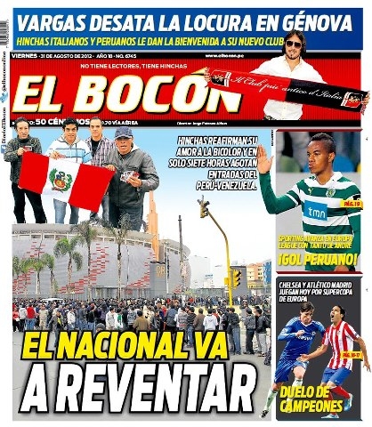 Además, el mencionado vespertino destaca el inicio de la venta de entradas para el duelo de la selección peruana ante Venezuela donde miles de aficionados llegaron e incluso acamparon horas antes en el estadio Nacional para obtener un boleto para el duelo por las Eliminatorias al Mundial Brasil 2014.