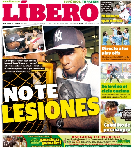 De esta manera, el diario Líbero tituló: 'No te lesiones', en referencia a la llegada de la 'Foquita' a Lima, quien junto a Carlos Zambrano causaron revuelo en el aeropuerto internacional Jorge Chávez.