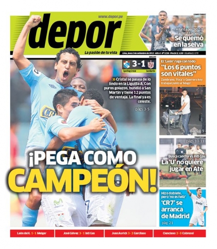 Por otro lado, el diario Depor tituló: '¡Pega como campeón!', en alusión al triunfo de Sporting Cristal sobre San Martín que lo ubican como puntero absoluto del Descentralizado.