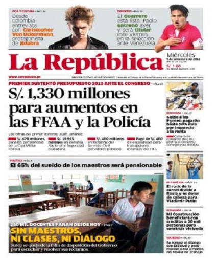 Por su parte, el periódico La República cede interés al primer ministro Juan Jiménez. El funcionario se presentó en el Congreso para sustentar el proyecto del Presupuesto Público para el año fiscal 2013, donde se solicitan S/.1,330 millones para dar comienzo a la reforma de régimen remunerativo y de pensiones de las Fuerzas Armadas (FFAA) y la Policía Nacional del Perú (PNP).
