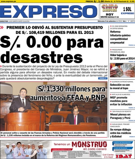 Cerramos este recorrido con Expreso, que al igual que los citados toca la presentación del Jefe del Gabinete Ministerial en el interior del Parlamento, para dar los pormenores del eventual presupuesto fiscal del año 2013.
