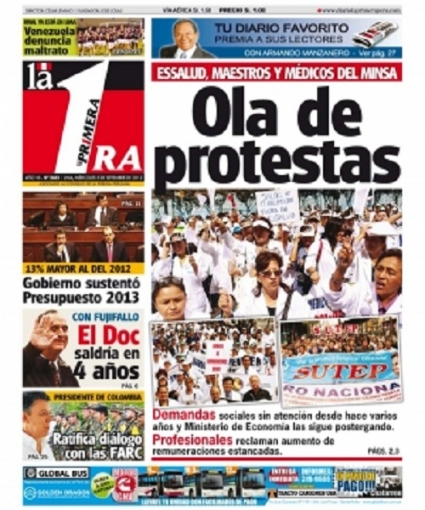 “Ola de protestas”. El vespertino La Primera recuerda en su primera hoja que hoy comienza el paro magisterial a nivel nacional, mientras que continúa el de los médicos del Ministerio de Salud. La razón de las manifestaciones es la exigencia de mejora salariales y la inclusión de algunos beneficios sociales.