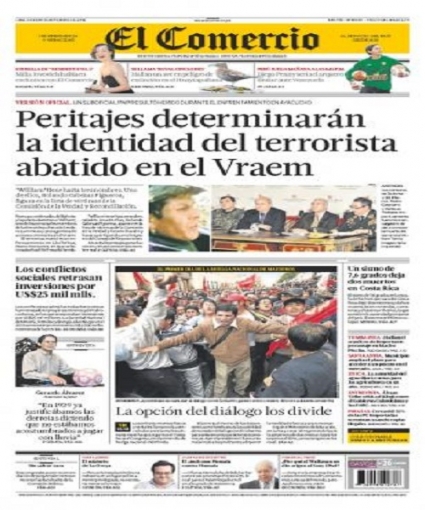 Iniciamos el desarrollo de la información con el diario El Comercio. La noticia la dio el propio presidente de la República Ollanta Humala, precisando que el hecho se produjo a las 08.45 horas de ayer en la zona de Yochegua, en la provincia ayacuchana de Huanta.