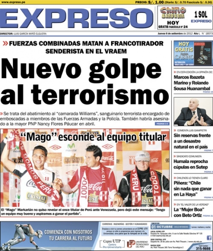 Entre los temas más destacados por la prensa escrita peruana para hoy jueves 6 de setiembre, está el anuncio de la muerte del supuesto francotirador subversivo que acabó con la vida de la capitana de la Policía Nacional del Perú (PNP) Nancy Flores, en una emboscada ocurrida en abril último abril en el Valle de los ríos Apurímac, Ene y Mantaro (VRAEM), durante un enfrentamiento con el Ejército.