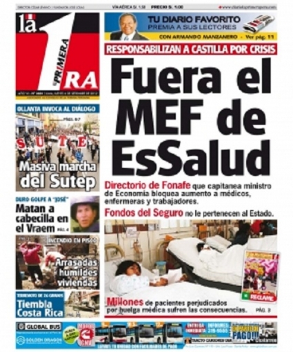 “Fuera el MEF de EsSalud”, este título aparece en la primera hoja de La Primera y son las palabras del exgerente general de EsSalud, Pedro Francke, quien aseguró que el Fondo Nacional de Financiamiento de la Actividad Empresarial del Estado (Fonafe) es responsable del paro de médicos que se viene presentando, y responsabilizó al ministro de Economía Miguel Castilla de impedir la utilización de recursos que exigen los manifestantes para satisfacer sus demandas, aclarando que el Fonafe se rige de acuerdo a los lineamientos de este ministerio.