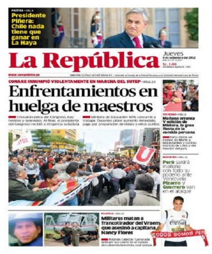 De otro lado, el periódico La República cede importancia al paro nacional de profesores. En el primer día de huelga, se registraron enfrentamientos entre los educadores del Sindicato Unitario de Trabajadores en la Educación del Perú (Sutep) con los del Comité Nacional de Reorganización y Reorientación del Sutep (Conare), en las calles del Centro Histórico de Lima.