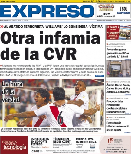 Culminamos este repaso con el diario Expreso, que también cede suportada al caso “Camarada William”, que al parecer estaría registrado como “Víctima” en el informe de la Comisión de la Verdad y Reconciliación (CVR).