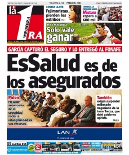 Los temas relativos al seguro social ganaron la primera hoja del vespertino La Primera. Jorge Rendón Vásquez, especialista en seguridad social, opinó que EsSalud debe ser una entidad autónoma “ya que es de los asegurados y no puede estar sujeta al Ministerio de Economía”, en alusión a la influencia del portafolio sobre el Fondo Nacional de Financiamiento de la Actividad Privada (Fonafe), cualidad a la que fue sometida en el último régimen aprista.