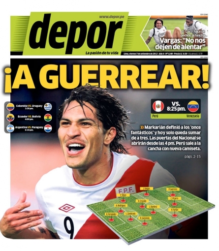 Por su parte, el diario Depor titula: '¡A guerrar!', refiriéndose al choque entre Perú y Venezuela por las Eliminatorias Brasil 2014.