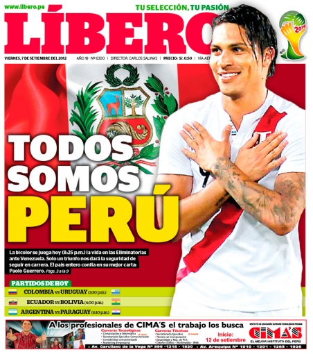 De esta manera, el diario Líbero tituló: 'Todos somos Perú', en referencia al encuentro entre la 'bicolor' y la 'vinotino' de esta noche (8:25 p.m.) en el estadio Nacional de Lima con la consigna de lograr los 3 puntos que les permita seguir con vida en el torneo sudamericano.