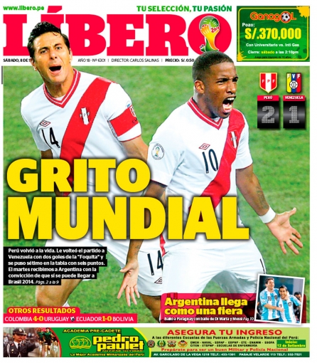 De esta manera, el diario Líbero tituló: 'Grito mundial', en referencia al importante triunfo obtenido por la 'blanquirroja' con una gran actuación de Jefferson Farfán, quien anotó los dos goles nacionales ante un complicado equipo venezolano que presionó en todo momento al cuadro de Sergio Markarián.