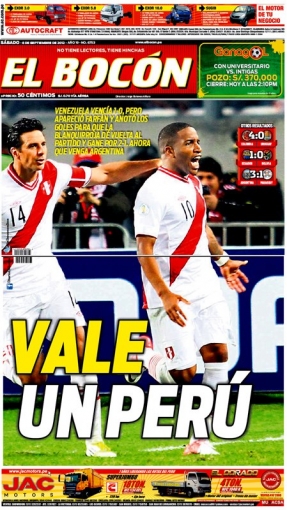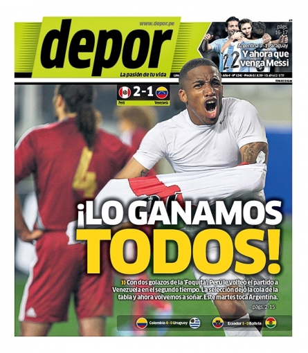 Por su parte, el diario Depor titula: '¡Lo ganamos todos!', en alusión al triunfo peruano sobre los llaneros con dos goles de Farfán que ubican al 'Equipo de todos' en el sétimo lugar a la espera de la poderosa selección Argentina que llegará a Lima este fin de semana para el choque del martes en Lima.