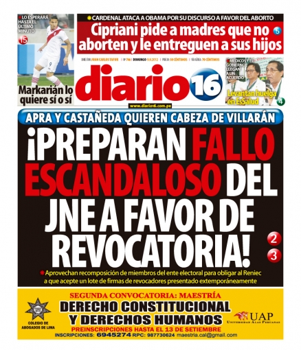 Cerramos este recorrido con Diario 16, que cede importancia a un supuesto próximo fallo del Jurado Nacional de Elecciones (JNE) a favor de las principales cabezas de la campaña de revocatoria de la alcaldesa de Lima, Susana Villarán.